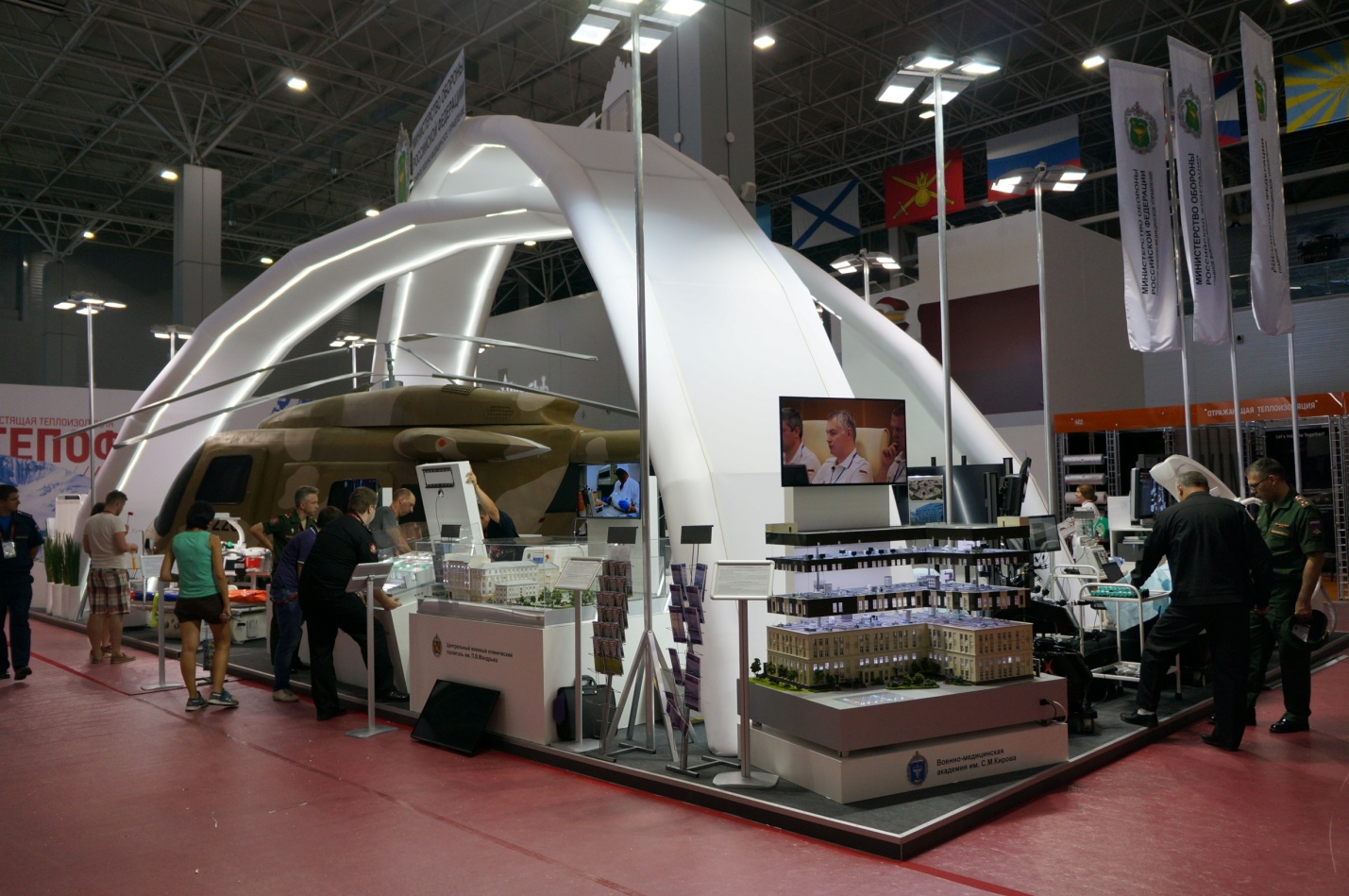 Экспозиция стенда представляла собой наглядную демонстрацию всех видов помощи начиная от поля боя (начало экспозиции), заканчивая высокоспециализированными многопрофильными учреждениями (ГВКГ им. Н.Н. Бурденко, ВМедА им. С.М. Кирова и др.) и санаторно-курортными реабилитационными центрами МО.