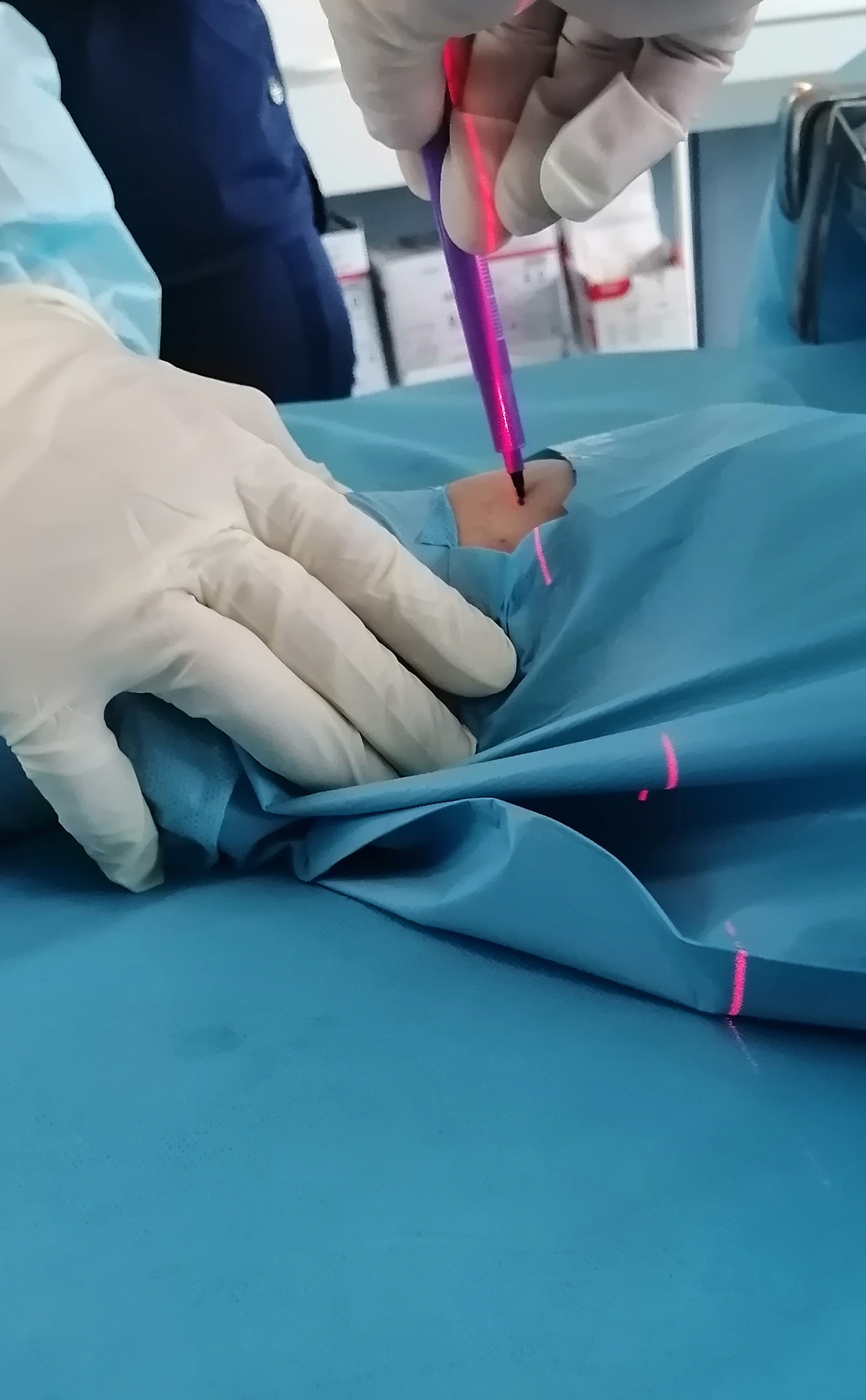 Для его реализации используется система, состоящая из нескольких маломощных лазерных излучателей, мощность которых аналогична мощности лазерной указки. «Лазерная разметка» позволяет хирургу максимально точно установить компоненты эндопротеза и, наряду с предоперационным планированием является одним из этапов контроля положения имплантатов.