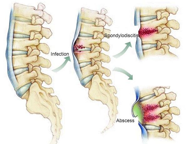 - скопление воспалительной жидкости и гноя в мягких тканях и суставах позвоночника (может стать причиной гнойного воспаления мозговых оболочек и спинномозговых нервов).