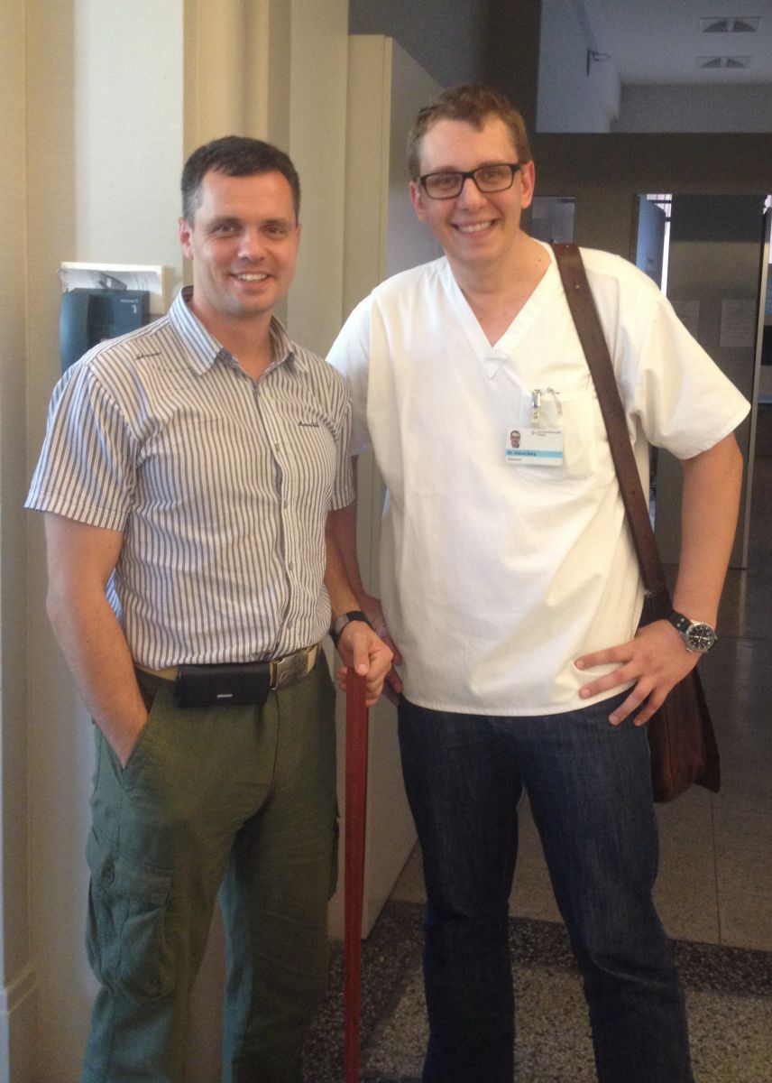 В июле 2014 года наши специалисты были приглашены в Швейцарию на семинар по проблемам хирургического лечения больных с деформациями различных отделов стопы, где мы несколько дней смогли поработать вместе с нашими швейцарскими коллегами в Университетском госпитале г. Базель. За это время нам удалось осбудить множество насущных проблем хирургии стопы, поделиться опытом и оценить совместные усилия по самым современным, малотравматичным и эффективным методикам операций и программам реабилитации пациентов (рис. 9.5, 9.6, 9,7).